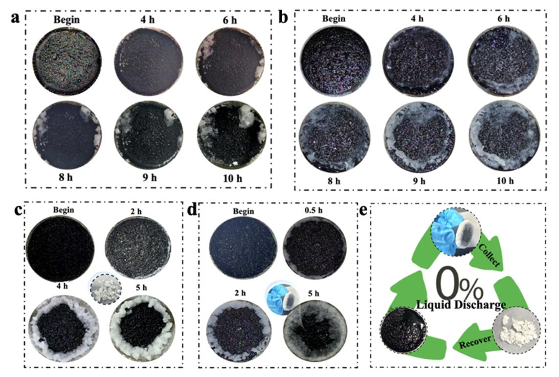 图2.蒸发器在(a)10%、(b)20%、(c)25%和(d)饱和盐水溶液中的边缘盐沉积效应;(e)用于零液体排放的饱和盐水中的盐收集和蒸发器回收路线