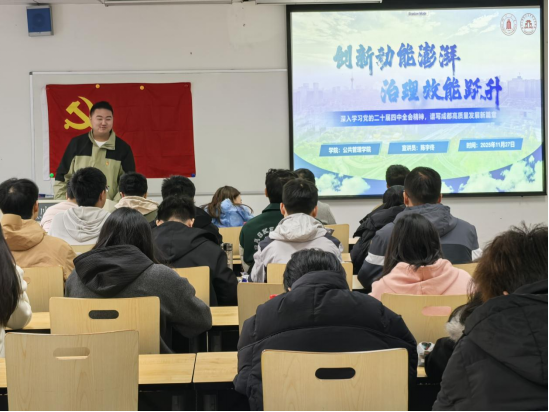公共管理学院陈宇佟同志以“深入学习党的二十届四中全会精神,谱写成都高质量发展新篇章”为主题,结合成都本地化率超90%的扎实发展实效、“天行者2号”等创新项目加速落地的生动实践,聚焦“创新动能澎湃、治理效能跃升”核心,阐述如何以全会精神为引领,激活城市创新与治理活力,为成都高质量发展注入更强劲动能。